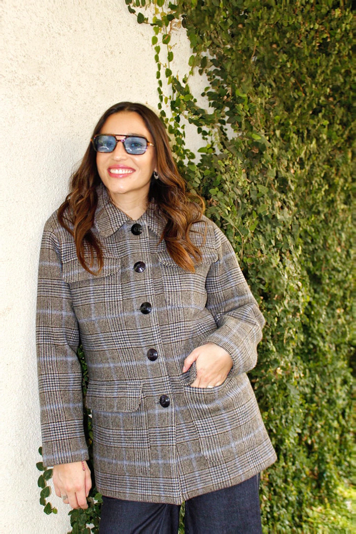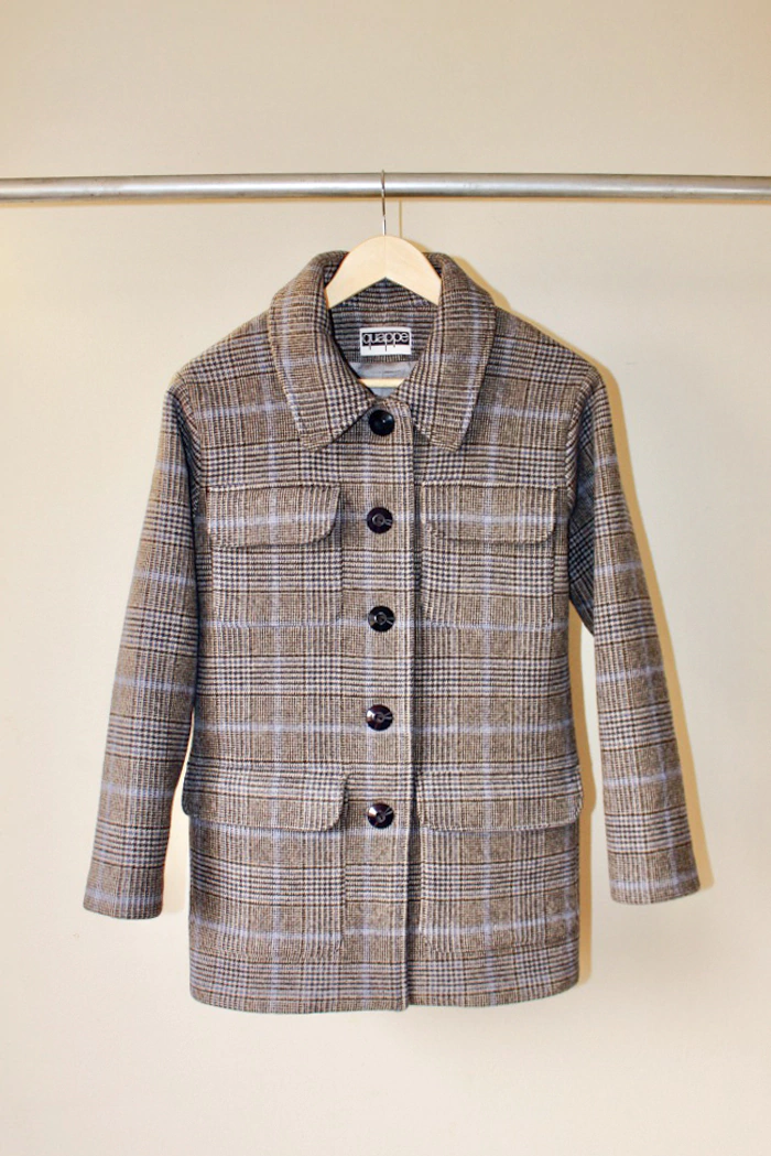 Abrigo Sastrero Confeccionado en Lana (100% ) con diseño clásico de print Principe de Gales, tiene 4 bolsillos y detalle de botones frontales para cerrar. Forrería en tafeta gris.